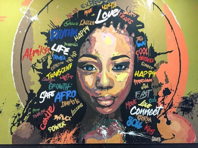 The contemporary artist engages a visual exploration of figurative art, painting them in mixed mediums such as acrylic, charcoal, water, colour, pencil and coffee on mostly paper & canvas of different dimensions. Tumi’s nostalgic nuance with a touch of texture is most notable in his Bontle Modisele Mural in her Dance Studio at the Hallmark House Hotel and the Cover Art for Priddy Ugly’s critically acclaimed sophomore album, SOIL.